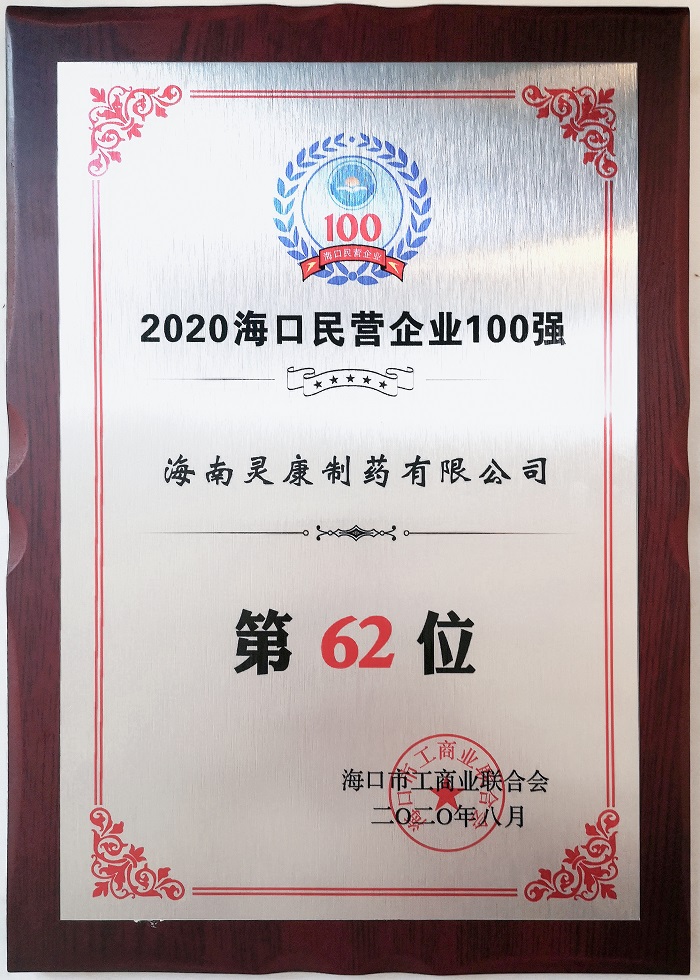 海南靈康制藥有限公司榮獲“2020年??谑忻駹I企業(yè)100強(qiáng)”稱號